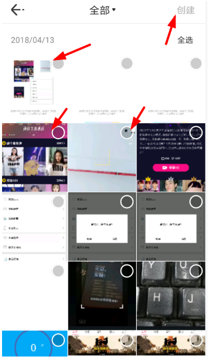 2、然后你需要将自己手机相册本地的图片进行选择,从中挑出要制作成为图片的那些,点击右上角“创建”功能。