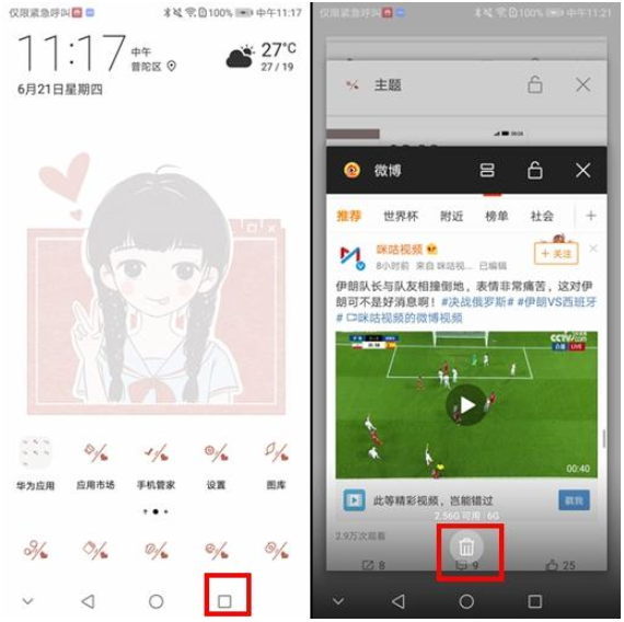 后台应用打开过多,这时就可以点击虚拟导航栏方块键,然后依次删除后台应用或者点击下面的垃圾桶图标,一次性删除后台应用。