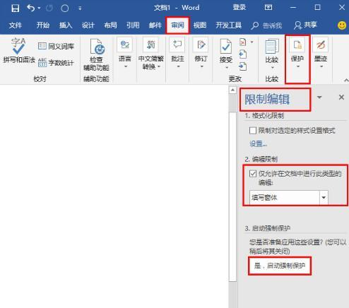 点击[审阅]—[保护]—[限制编辑],勾选第二项的[仅允许在文档中进行此类型的编辑],在该菜单中选择[填写窗体],最后点击第三项的[是,启动强制保护]。
