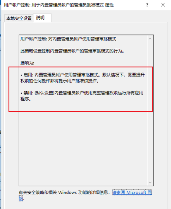 我们也可以看一下今天说说内置管理员账户的管理员批准模式的说明,可以看到禁用的话,会提升内置管理员账户的权限,可以打开所有应用,如下图所示: