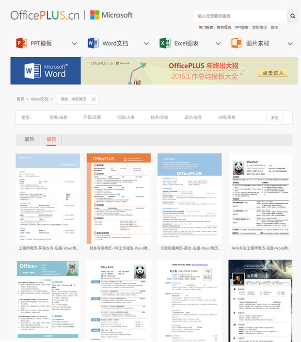 如果感觉Word自带的模板无法满足需要,也可以进入OfficePlus网站搜索更多的模板。这是微软自己的网站,可以看作是Office内置模板的网站升级版。所有模板按照PPT模板、Word模板、Excel模板、图片素材进行分类,也可以直接输入关键字搜索需要的模板。和内置模板一样,这里的模板也都是免费的。