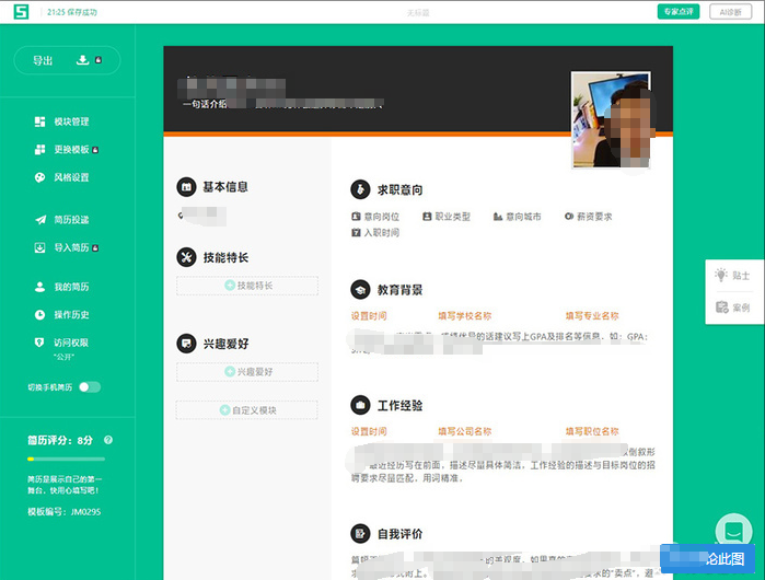 五百丁将编辑页左侧设计为模块控制页,右侧设计为编辑区,所有模块都可以任意添加与删除。和“简历本”相比,“五百丁”有一个最亮眼的地方,那就是通过对简历打分,告诉你简历中还有哪些还能再优化。这对于初入职场的小菜鸟们来说,无疑是一个很贴心的设计。不过“五百丁”不支持做好简历的免费导出,只能通过电子邮件投递。如果确实需要将简历保存导出,就需要交费来充会员了,这大概就算漂亮的代价吧!