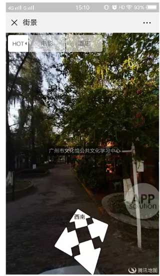 画面中会标注东南西北等方向,即使你分不清坐标也可以跟着这个方向走。并且,选择上方的“电影”或“酒店”,就能知道附近最近的电影院和酒店怎么走了。