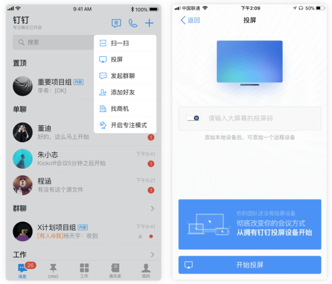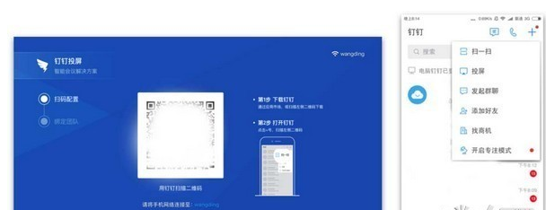 实现钉钉投屏功能的方式就是无线投屏,通过软硬件配套性解决方案,可快速改造传统会议室。我们打开钉钉主界面点击“+”号,即可调起投屏功能,搜索到周围可用的智能大屏后,输入大屏显示的投屏码,立即连接大屏开始投屏。