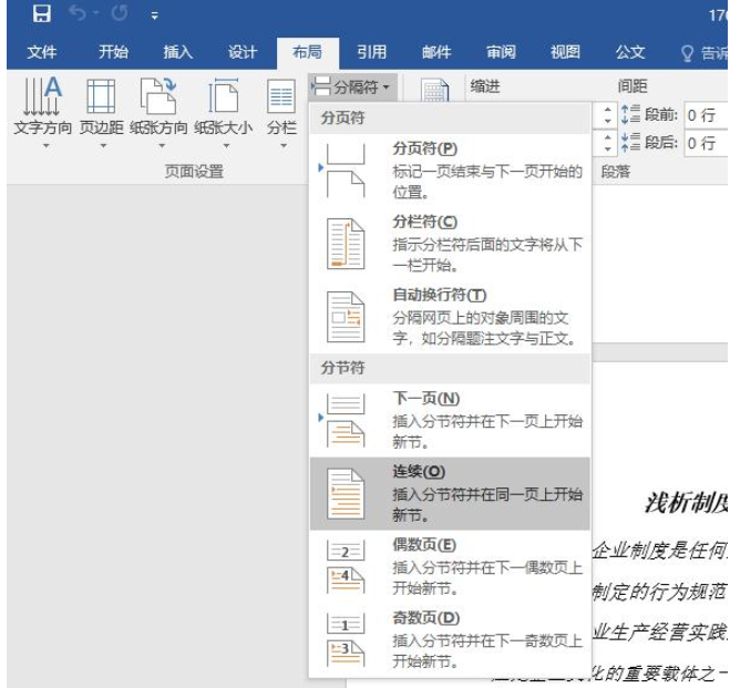 点击【分隔符】→【分节符】→【连续】,然后下一页改页眉前,按一下“同前”钮,之后做的改动就不影响前面的了。