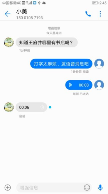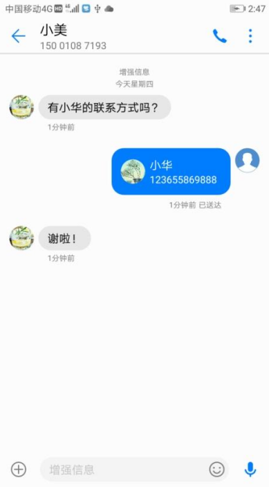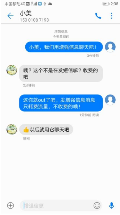 华为的增强信息有两个最大的优势。第一,发送增强信息不需要添加好友,只需要知道对方的号码就可以了。第二,使用增强信息只耗费流量,不收取任何费用,从此之后短彩信的开销就省了。