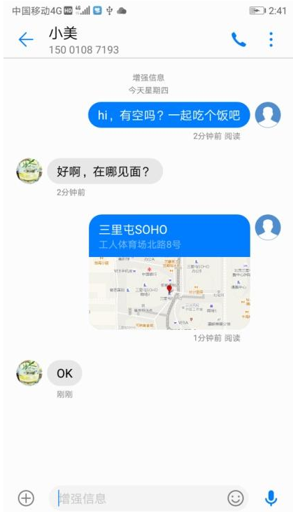 想约个饭,却不知道详细地点?只需要使用增强信息发送地理位置信息给对方就可以轻松搞定。点击地理位置可以使用导航前往,方便又快捷!