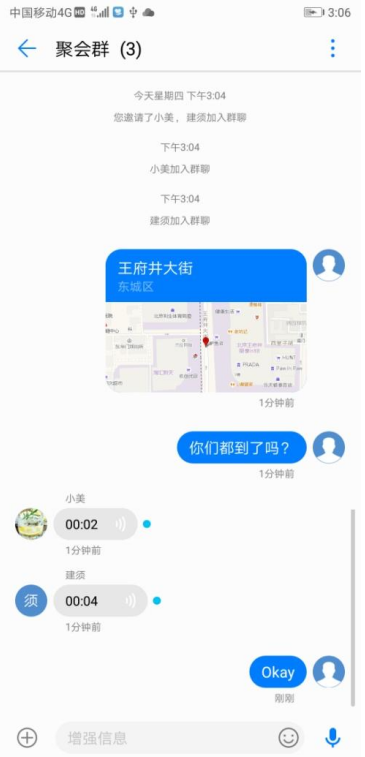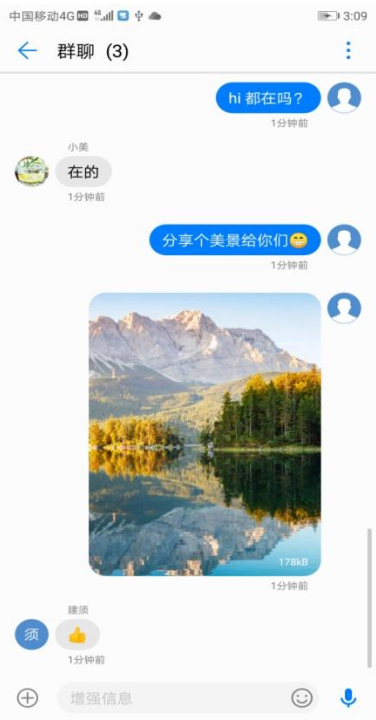 华为在EMUI 8.0推出融合通信,短信App已开启“增强信息”模式,增强信息模式下,不仅发送短信免费,发送图片、语音、视频、地理位置、VCard等也都是免费的,还支持免费群聊。