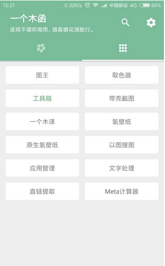 一个木函app是一款集合了多种强大功能的手机应用,主要包含了应用管理(预装卸载、查看权限、复制信息)、文字处理(文字编码、提取、替换、叠加)、中英互译、WIFI密码查看等功能,非常强大!