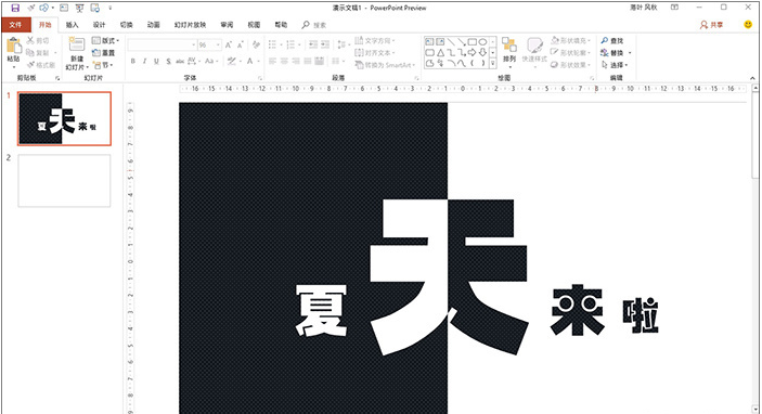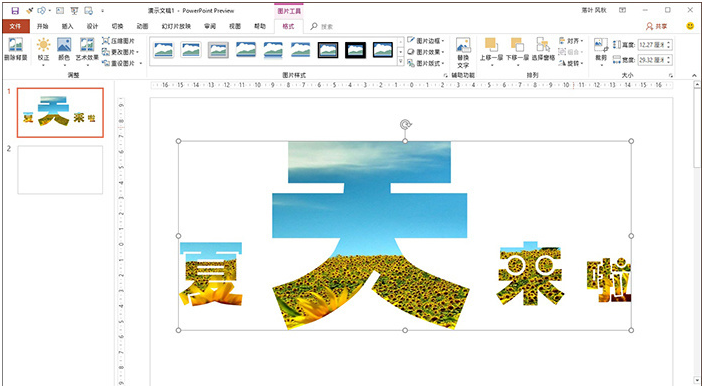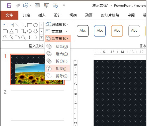 具体操作也很简单,同时选中文字层和背景图(注意背景图一定要在文字之上,如果不是,就右击选择“置于顶层”调整一下两个图层的顺序,这一点和Photoshop里的图层很像~),然后在“绘图工具”→“插入形状”→“合并形状”里选择“相交”就可以了。