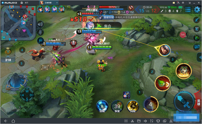 进入游戏,不论是带线、打野还是大小规模的团战,MuMu模拟器的表现都十分稳定,带线打野帧率维持在满帧60,而团战则在55帧左右,整场游戏下来流畅运行,没有顿卡的感觉。