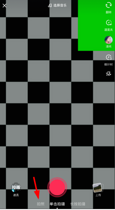 1、打开抖音APP,点击页面下方“+”按钮,进入拍摄页面之后选择“拍照”功能进行设置。