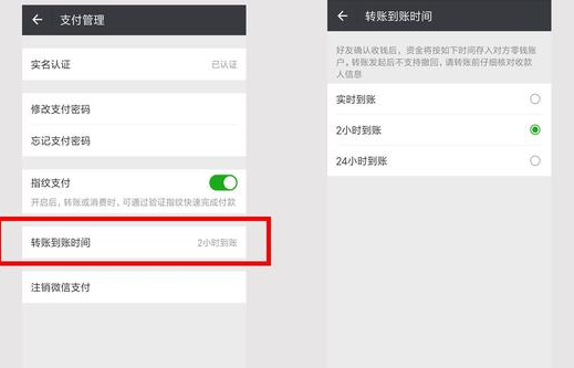 然后点击转账到账时间,这里可以设置2小时到账,24小时到账