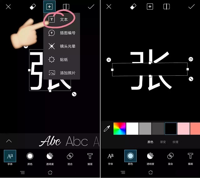 三、然后在纯黑色背景素材中,点击添加文本,然后输入你的姓氏,比如你姓“张”,字体颜色为白色,然后将字放置正中,再点击“+”号放大子图,如图所示。