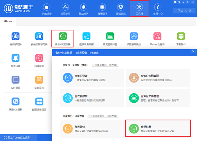 降级成功后,手机内全部数据会被清空,可以将备份过的文件恢复到手机里,打开【工具箱】-【备份/恢复数据】,选择【分类恢复】。