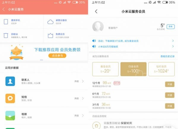会员免费提供5GB永久空间,往后提供5+20/100/1024GB扩容可选,有效期也分3/6/12个月算,价格从18米币到499米币不等(1米币=1元)。