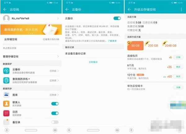 当然,华为也提供了几套云空间的升级方案,分别有50/200/2048GB(2TB)三种可选。计费方式有连续自动包月、6/12个月包三种,价格从6元到最高680元不等