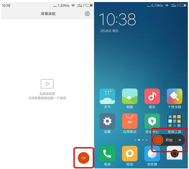 打开录屏功能之后,点击右下角的“摄像机”形状,之后会自动切换到手机主界面,然后在手机主界面中可以看到一个圆角矩形的界面,点击开始,软件就开始自动运行了,也就是自动录制屏幕中你所有的操作啦。