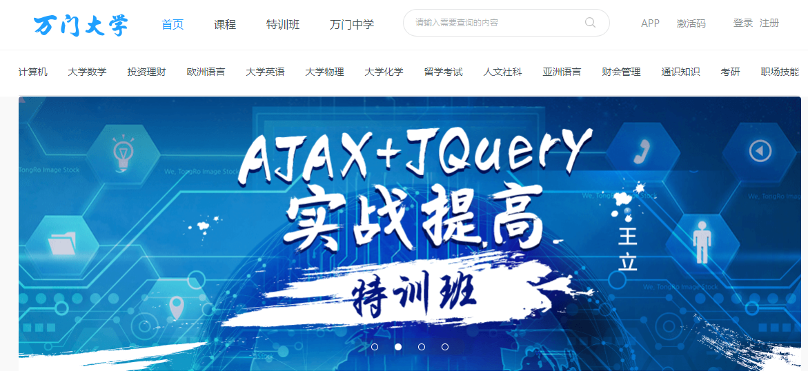 万门大学是一个在线学习网站,课程内容非常丰富,覆盖了职场、语言、计算机、小程序开发、大学、中学以及小学;