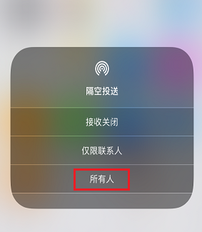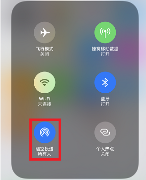 首先打开iPhone手机的【隔空投送】功能,从屏幕下方任意位置向上滑动,呼出【控制中心】,长按左上角的模块,找到【隔空投送】按钮,点击选择【所有人】;