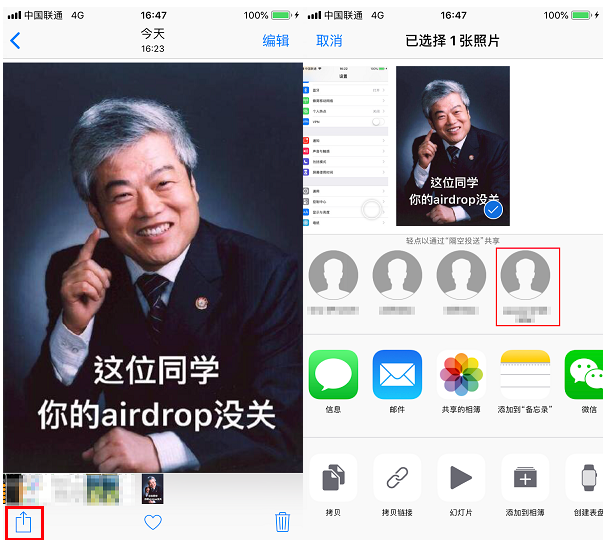 在【照片】中选定一张图片,然后点击左下角的【我来教你】按钮,就可以查看到附近同样打开【隔空投送】的人,轻触头像,即可成功发送;
