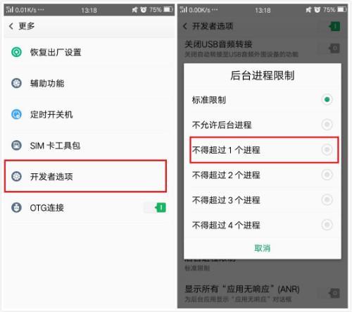 点击[设置]——[更多]——[开发者选项]——[后台进程限制]——[不得超过1个进程]。