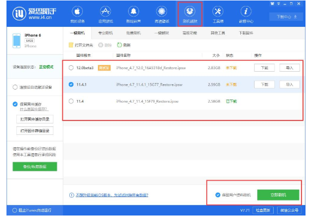 打开爱思助手PC端,将iPhone连接到电脑,在【刷机越狱】—【一键刷机】中进行操作,请选择适合的固件版本,并勾选“保留用户资料刷机”。
