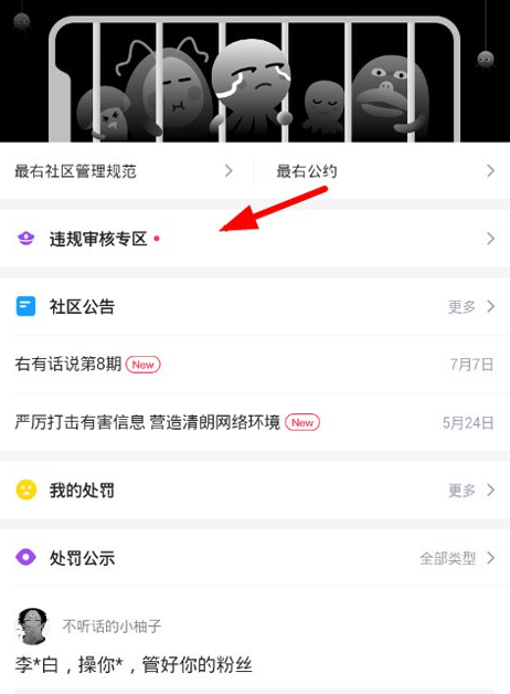 2、在进入小黑屋之后,选择“违规审核专区”的选项,就可以去申请成为最右的社区治理员了。