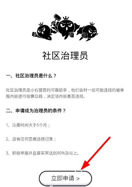 3、在这之后,用户只需要点击“立即申请”选项,就可以开始进行考试审核,审核成功率在60%以上的话就可以成为社区治理员了。