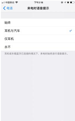 设置方法:【电话】-【来电时语音提示】上选择【耳机与汽车】。