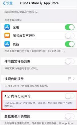 “设置”→“iTunes store与App Store”→关闭“App内评分及评论”。