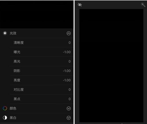 最后,我们只要把“光效”中的“曝光”“阴影”“亮度”,这三个数值拉倒最低“-1”。这个时候我们的照片就全黑了,想要恢复,同样在编辑模式里点“复原”就可以了。