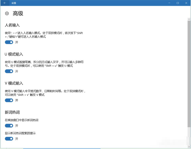 1、首先检查U模式输入是否处于开启状态。顺序为设置→时间和语言→区域和语言→中文(中华人民共和国)→选项→微软拼音→选项→高级→U模式输入。