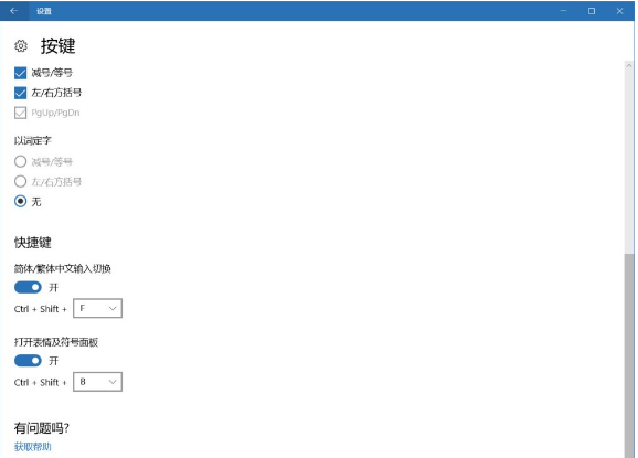3、此外你也可以通过快捷键的方式打开表情及符号面板。顺序为设置→时间和语言→区域和语言→中文(中华人民共和国)→选项→微软拼音→选项→按键→打开表情及符号面板按钮。