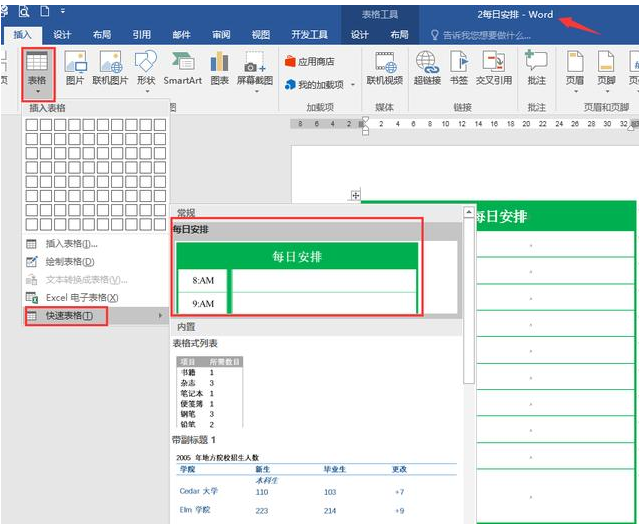 当我们要在文档中快速插入表格时,点击插入——表格——快速表格——选取插入即可。