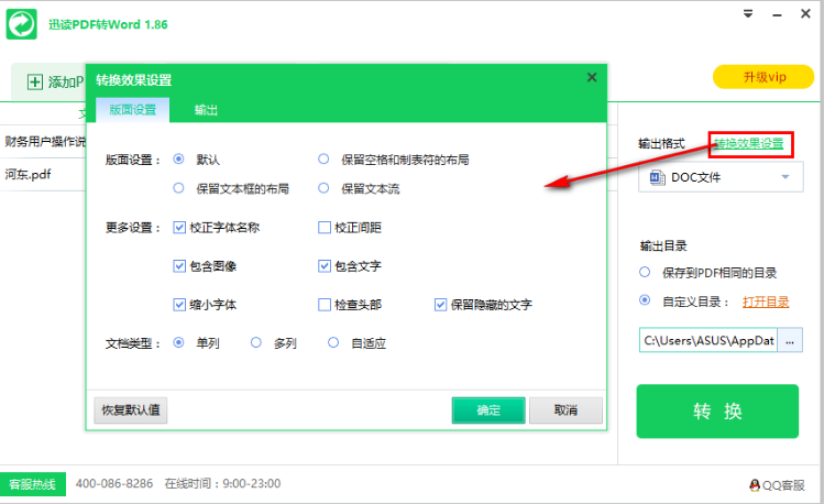 8、您还可以点击转换效果设置,然后即可对版面设置、文档类型等参数进行进行全面的设置。
