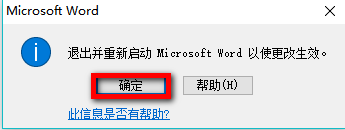关闭窗口以后,会弹出一个提示窗口,要求关闭重启Word后才能生效,在窗口中点【确定】即可。