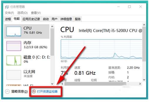 3、点击性能后,在页面图示位置点击【打开资源监视器】。