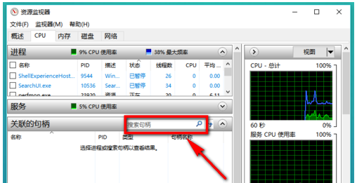 4、进入到资源监视器页面,在图示位置搜索我们要删除的文件夹的名称。