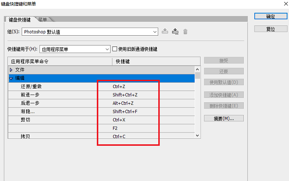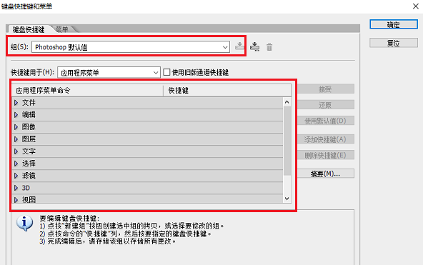 进去键盘快捷键和菜单界面,可以看到默认使用的PS快捷键,主要分为文件、编辑、图像、图层等快捷键设置,如下图所示: