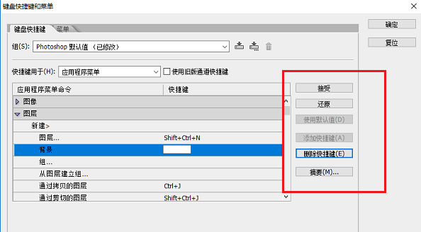 点击快捷键,可以进行设置,同时按住想要设置的快捷键,点击确定就设置成功了,上面的分组也会变成photoshop默认值(已修改),如下图所示: