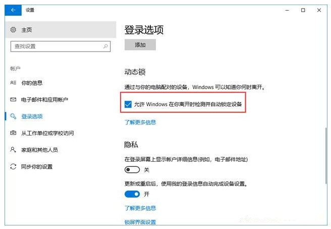 配对成功后,使用快捷键【Win】+【X】进入到设置界面-【账户】-【登陆选项】,找到动态锁,勾选允许Windows在你离开时检测并自动锁定设备。