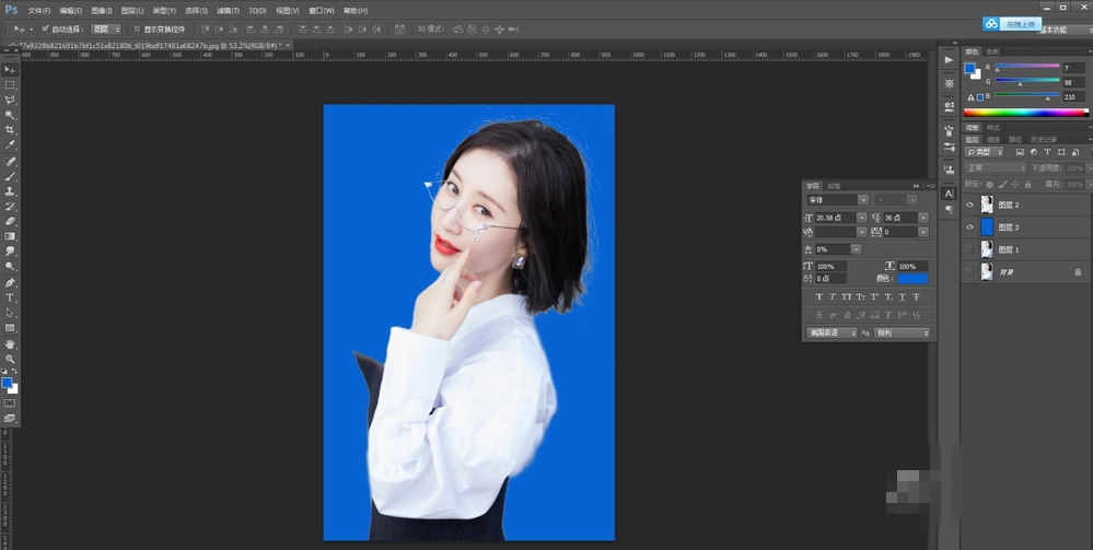 9、在下面新建一个图层,填充蓝色,可以看到头发被扣出来了。