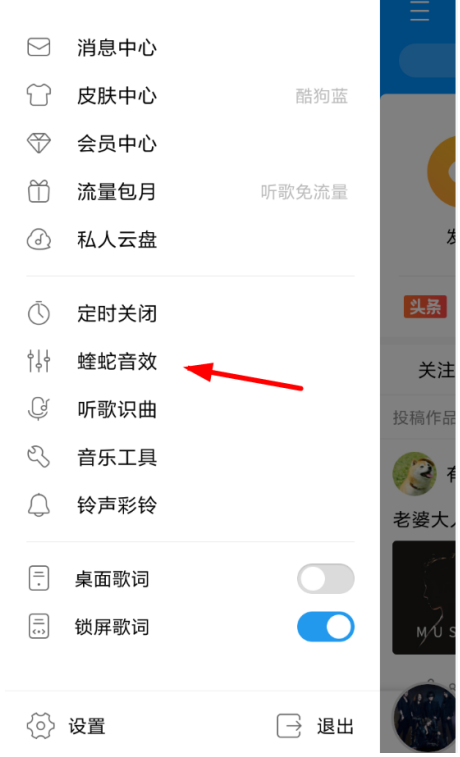 打开酷狗音乐APP,打开功能列表登录账号,并选择“蝰蛇音效”功能。