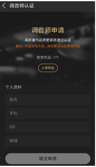 用户需要先上传一个音效作品,然后填好个人资料进行提交,等待官方审核通过后就可以成为调音师了!