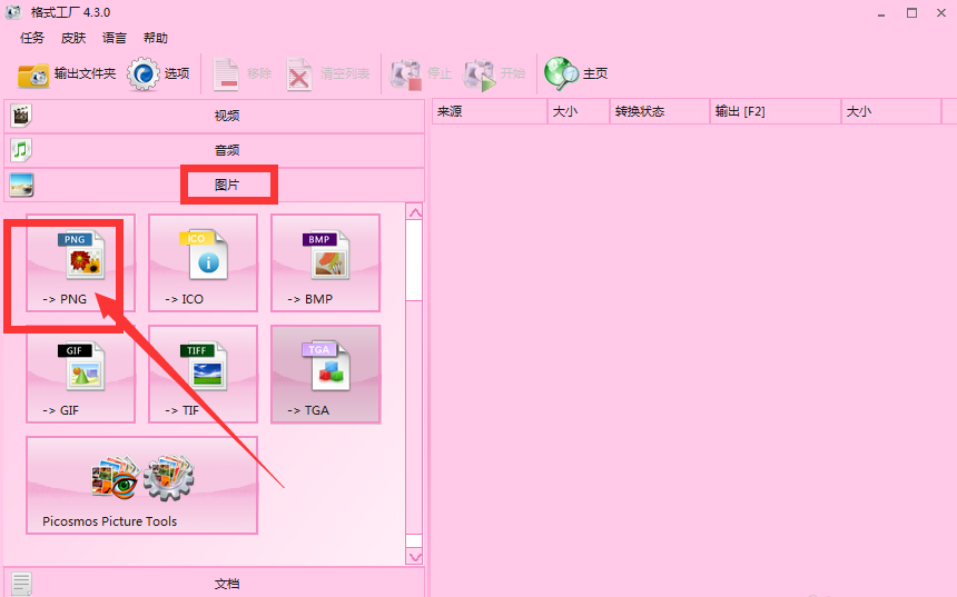 打开格式工厂,进入首页,在左侧菜单位置找到图片选项,点击打开,