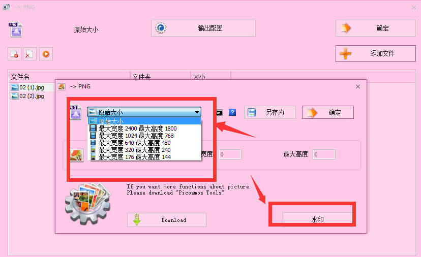 在其中选择输出的大小尺寸或添加水印等编辑状态,