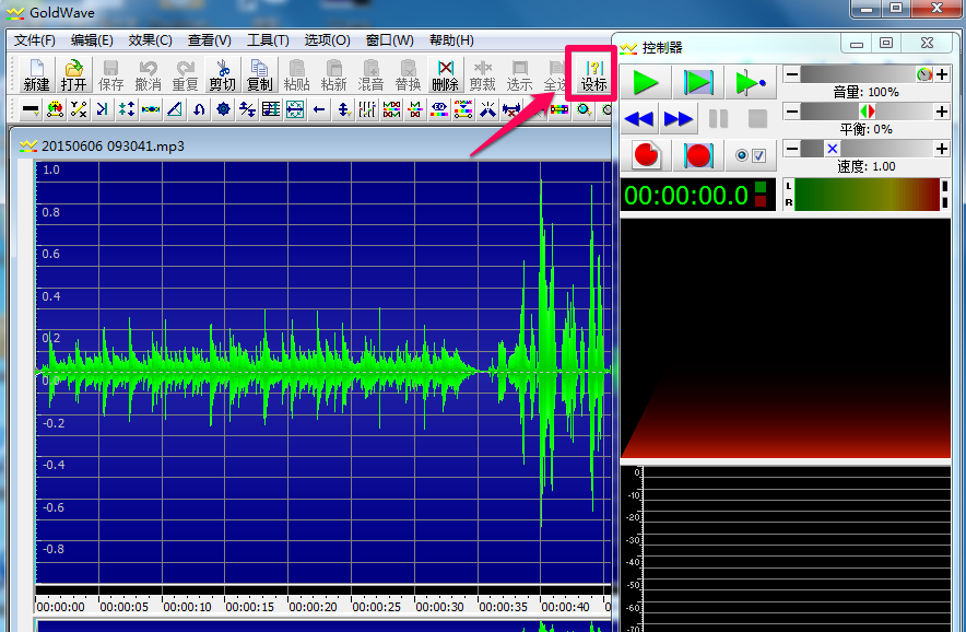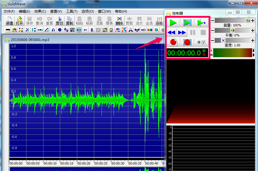 1、打开GoldWave软件,打开需要剪辑的音乐文件。如图,右边的控制器可以通过按钮来控制音乐播放与暂停,这个有助于我们在剪辑过程中试播。