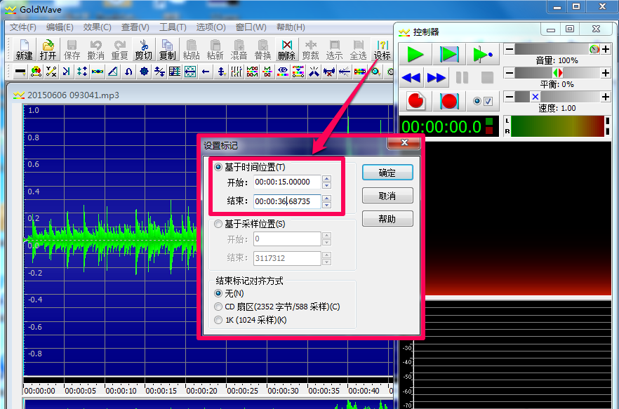 2、选取区段有两个方法,一是通过GoldWave软件的“设标”功能来准确定位音乐的时间轴(示例为选取原音乐15秒开始到36.68735秒结束),也可以通过拉动,如图。