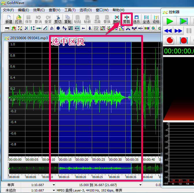 3、以设标选取为例,我们现在选中了“原音乐15秒到36.687秒”这个区段,你如果想保存这一段,可以点击“剪裁”;如果你想删除这一段,可以点击“删除”。